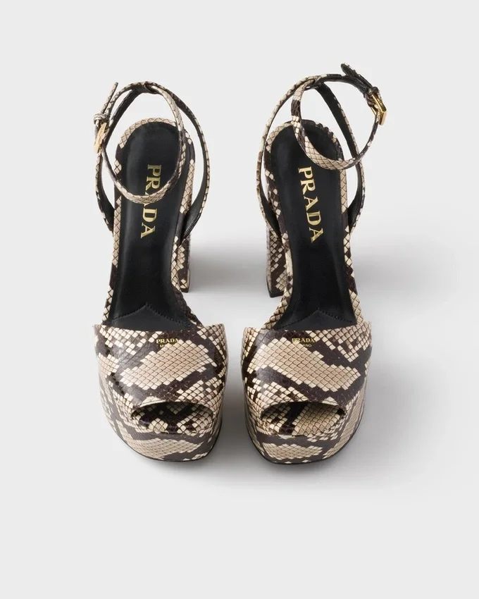 The Bold, Contemporary Silhouette of These High-Heeled Platform Sandals Completed by a Refined Ankle Strap is Made Unique by the Luxurious Textured of Python-Print Ayers Leather.